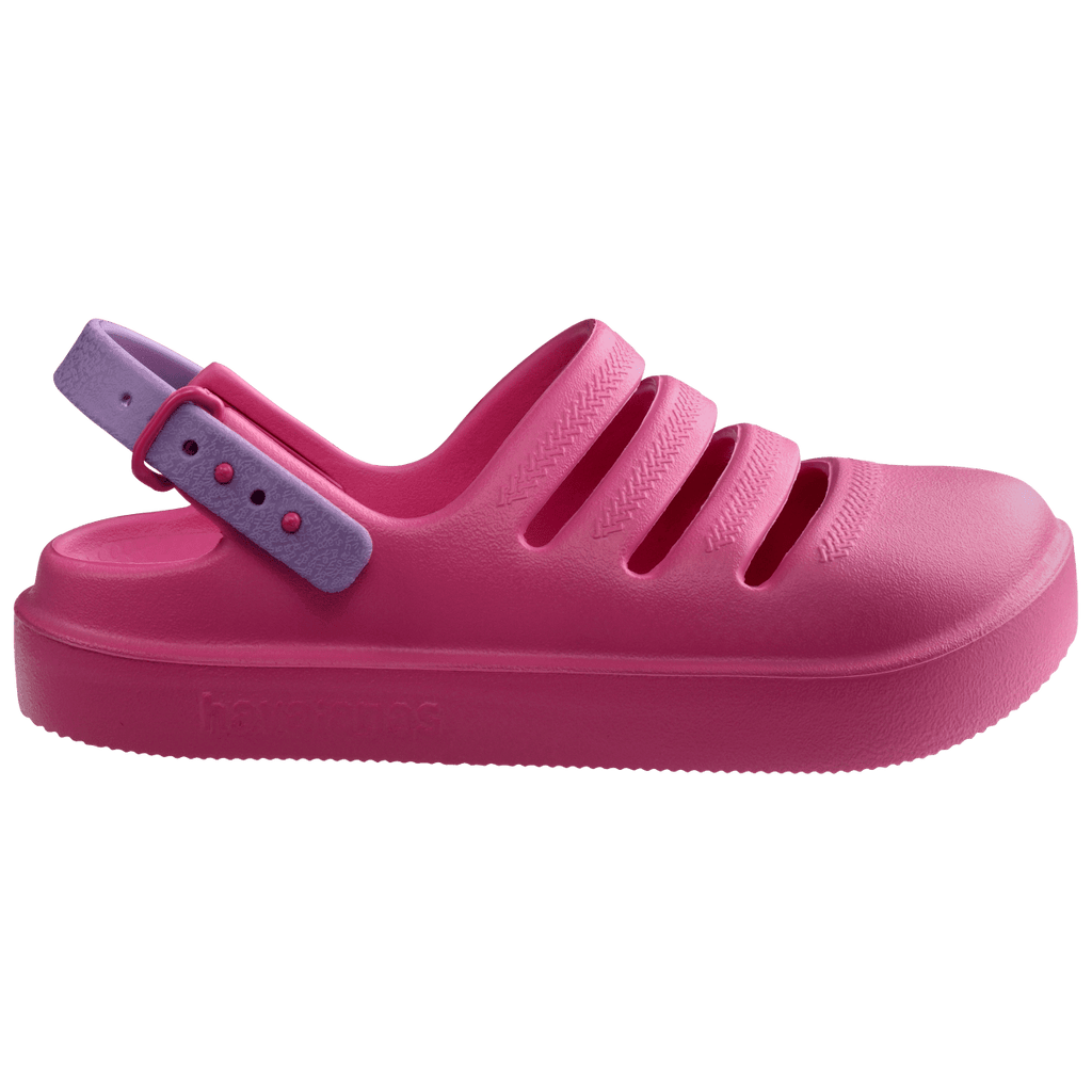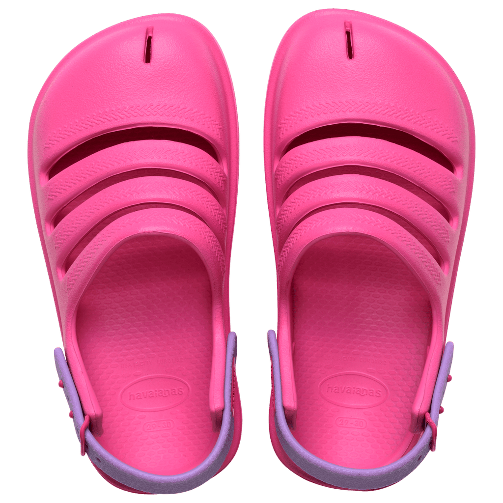 A Havaianas Kids Clog é o sapato perfeitamente feito para as crianças. Fechado na frente e com tiras horizontais com a estampa das gregas em alto relevo, o Clog também é fechado na parte de trás, com uma tira regulável, que garante a firmeza nos pés da criançada.