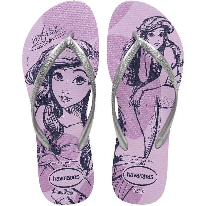 Troque o sapatinho de cristal pelo conforto de um bom par de Havaianas! O modelo Slim Princesas não tem limite de idade: é para todas que se encantam com as princesas da Disney até hoje. Com traços estilizados e modernos, as estampas têm três versões: Cinderella, Ariel e Branca de Neve. Para coroar, as tiras são metalizadas.