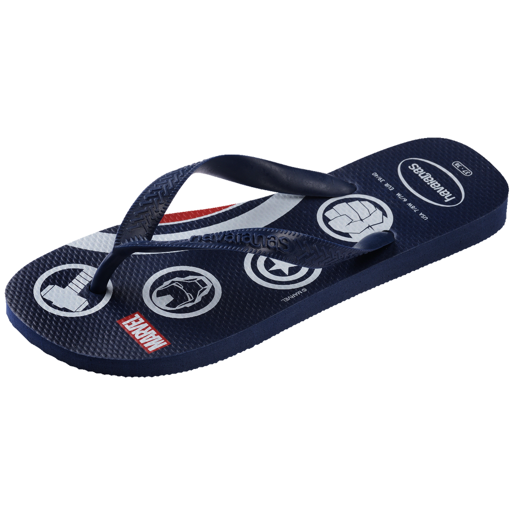 A Havaianas Top Marvel Logomania tem solas estampadas justamente com essas representações icônicas: uma mão verde (Hulk), um capacete (Homem de Ferro) e uma máscara (Homem Aranha).