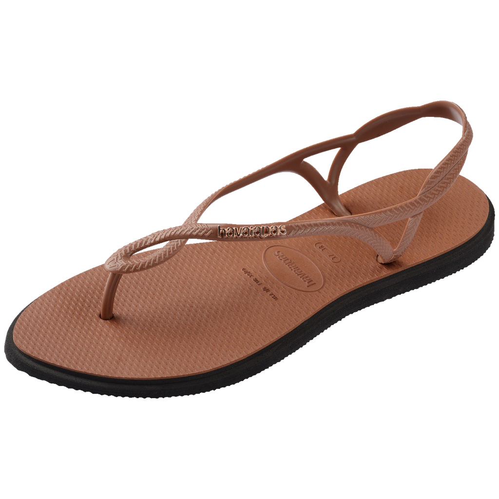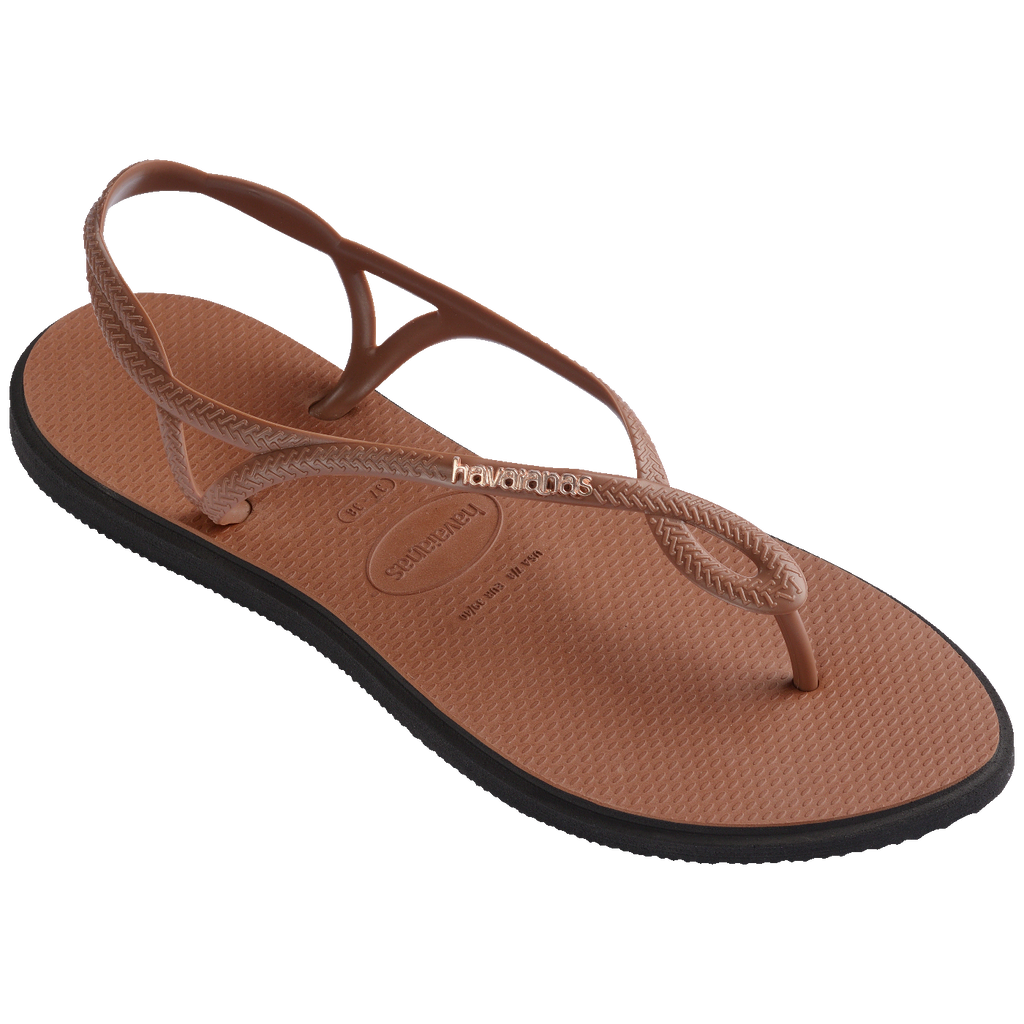 Seu diferencial é o bico levemente pontudo, que é a nova tendência, e mantém as tiras do modelo Luna, que abraçam o calcanhar e se cruzam na frente para formar um oval na dedeira.
