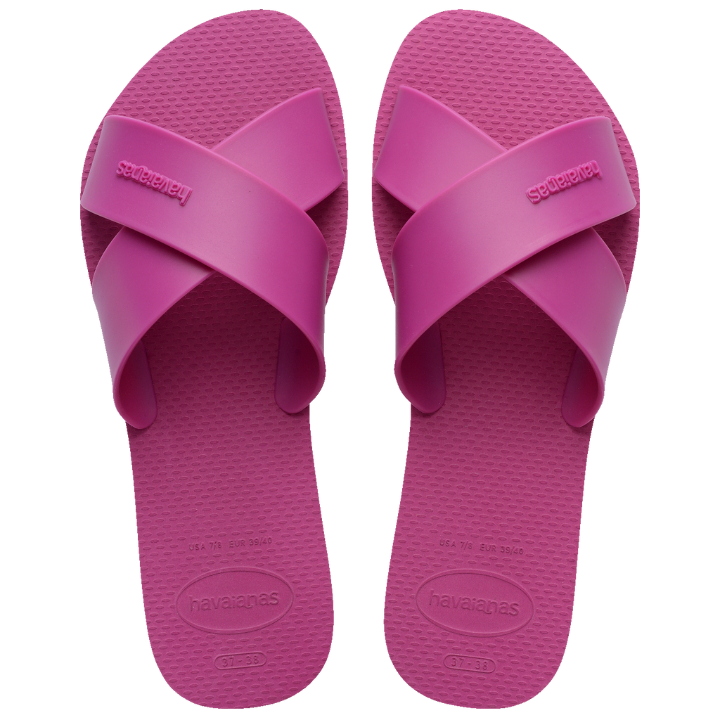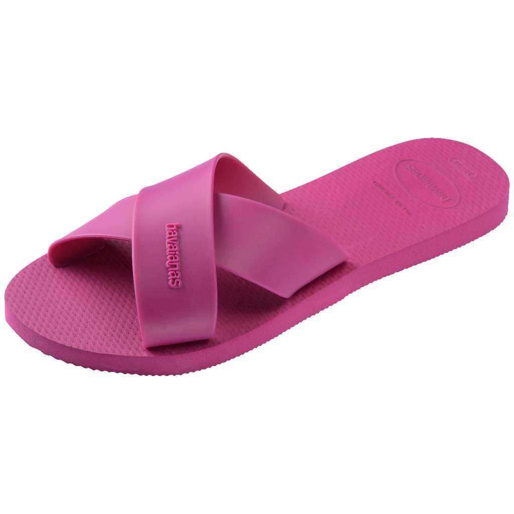 A slide Havaianas Aqua tem duas tiras largas que formam um X na parte da frente e vem numa cartela de cores que deixa qualquer look mais vivo.